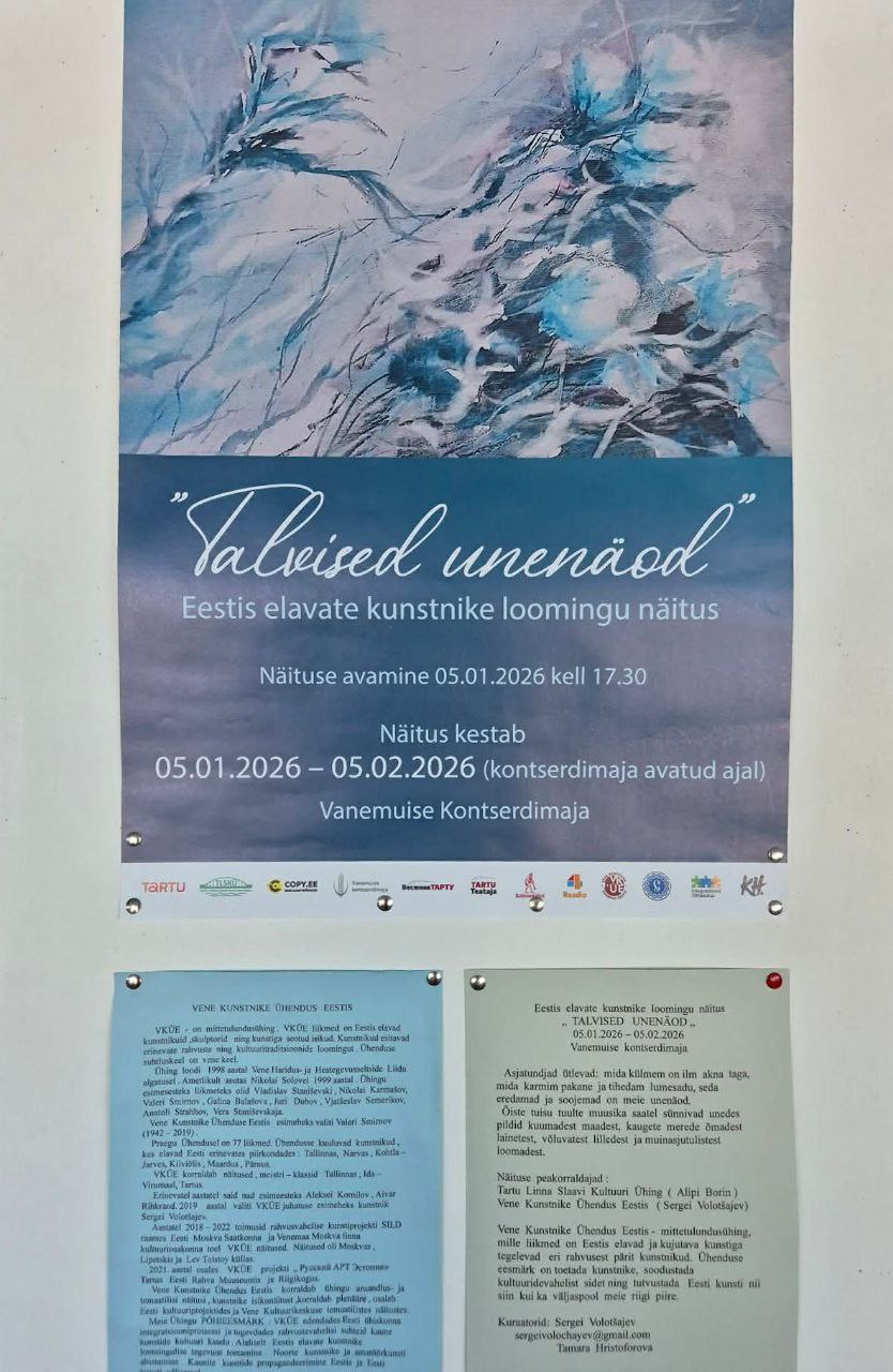 Tartu linna slaavi kultuuride selts kutsub teid 5. jaanuarist kuni 5. veebruarini 2026 kunstinäitusele “Talveuned”, mis toimub Vanemuise teatri kontserdimajas.