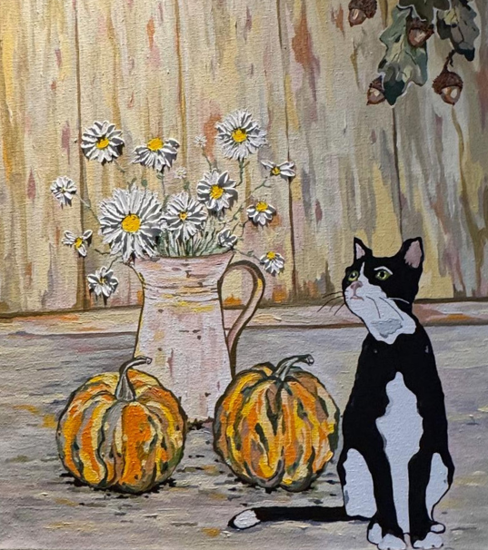 The painting “October” is a warm and cozy scene filled with the spirit of autumn. Created in the genre of animalistic art with elements of impressionism, the artist captures the harmonious coexistence of nature, everyday objects, and the animal world.
